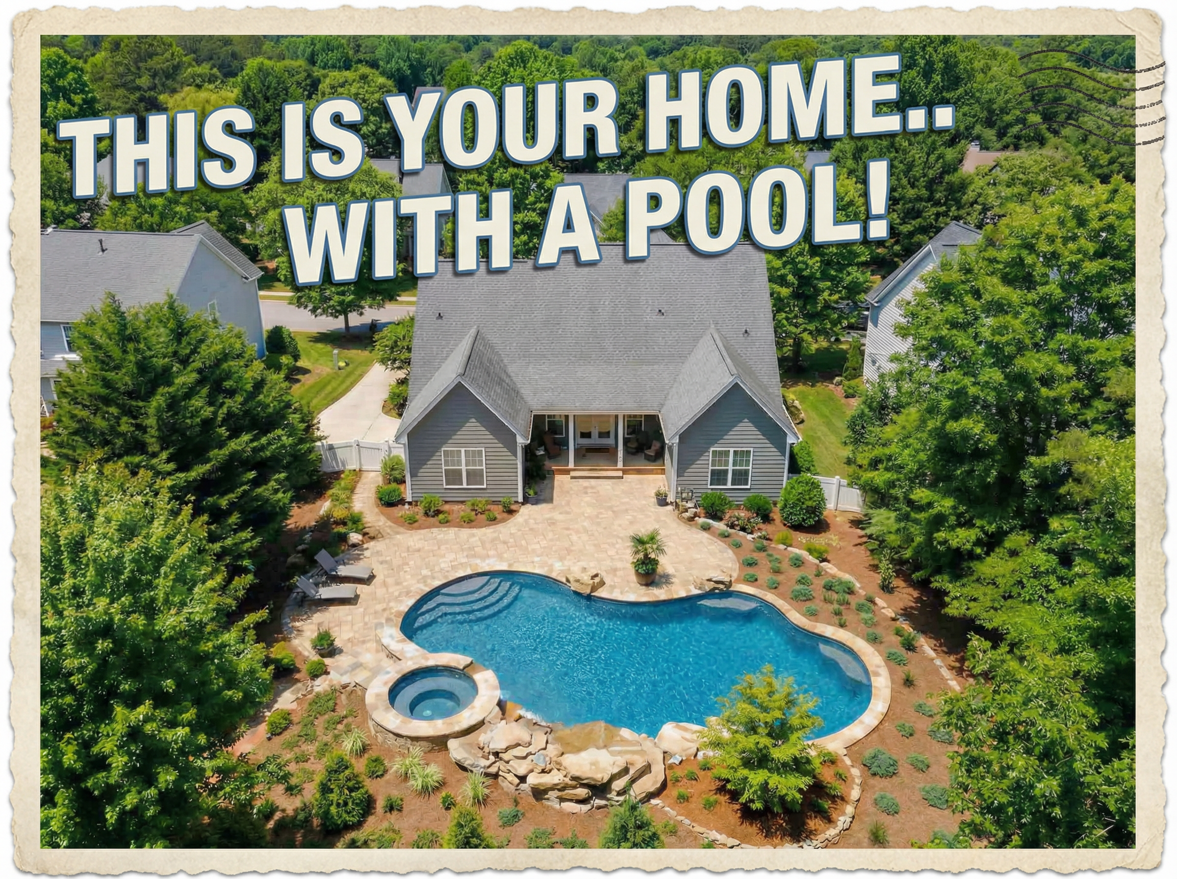 Every postcard shows the homeowner's actual backyard with a pool already in it. It's personal. It stops them mid-sort at the mailbox.